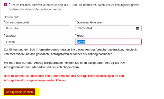 Klicken Sie hierzu auf den Button „Antrag herunterladen“. Nach dem Herunterladen des Antrags können keine Anpassungen an dem Antragsformular vorgenommen werden.
