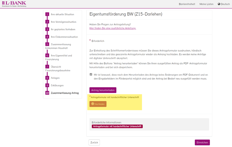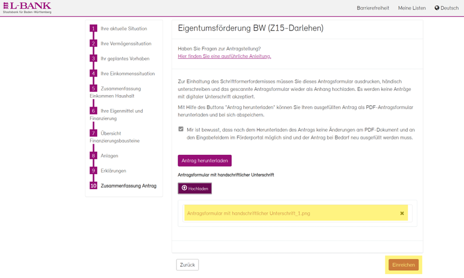 Um den Antrag an die zuständige Wohnraumförderungsstelle abzuschicken, klicken Sie auf „Einreichen“.