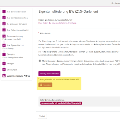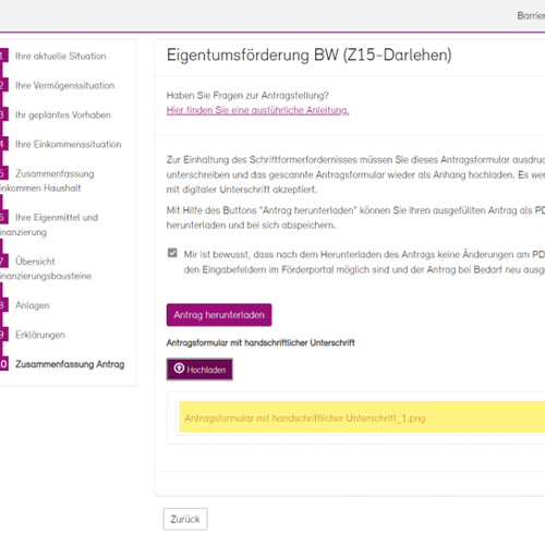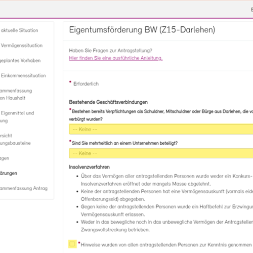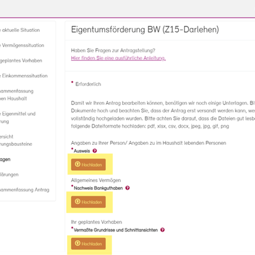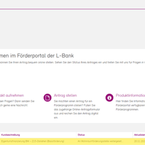 Über das Förderportal können Sie Ihren Darlehensantrag bequem digital stellen. Bitte beachten Sie: Derzeit ist nur eine Antragstellung für das Programm „Eigentumsförderung BW (Z15-Darlehen)“ möglich. Weitere Programme folgen.