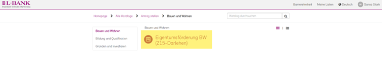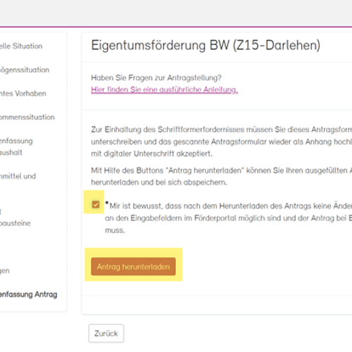 Wählen Sie das Förderprogramm „Eigentumsförderung BW (Z15-Darlehen)“ aus.