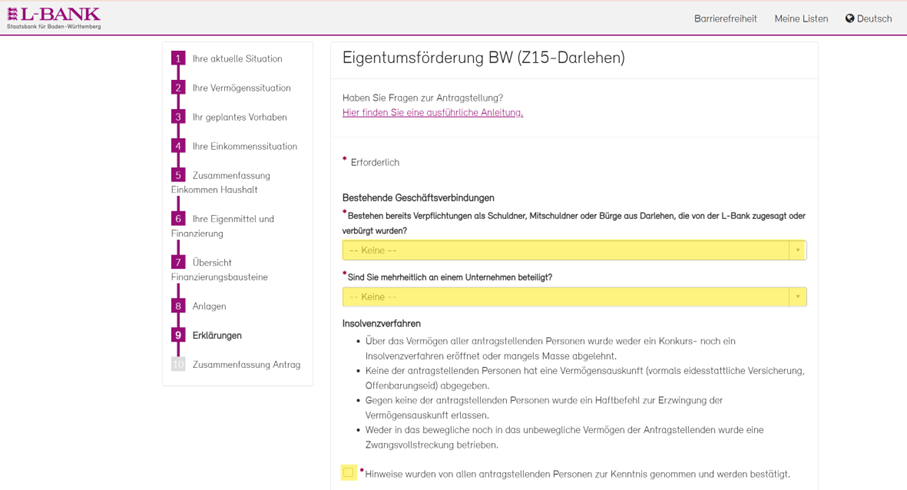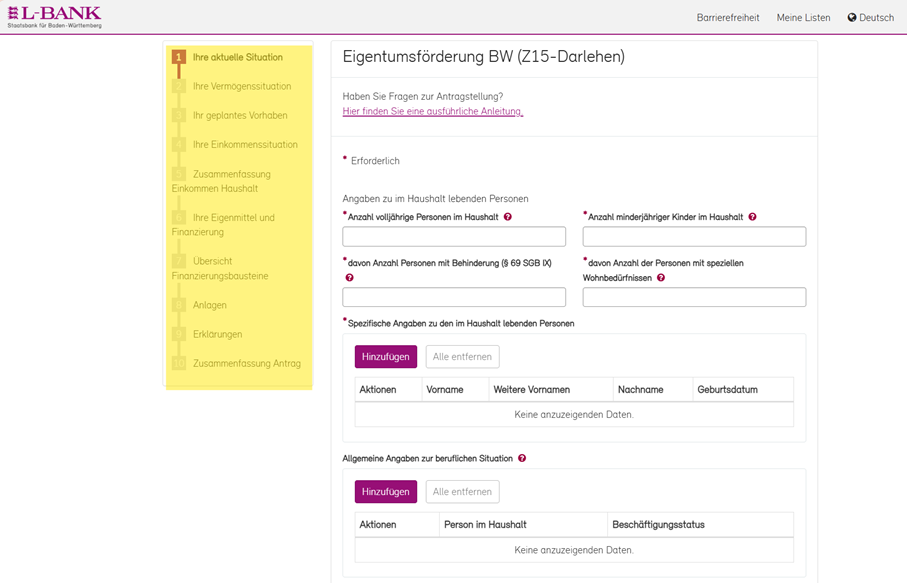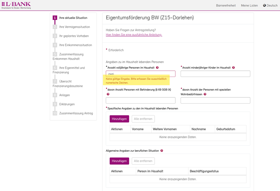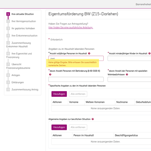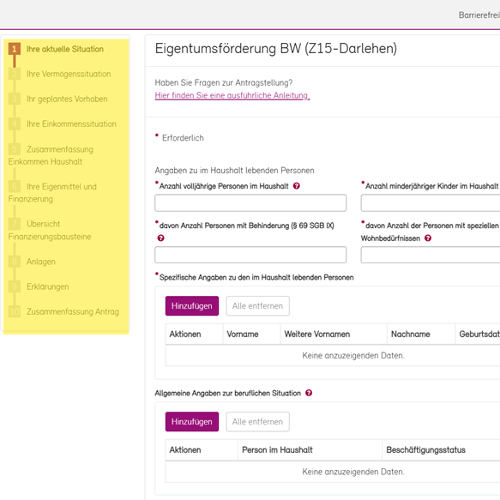 Ihre eingegebenen Daten bleiben gespeichert und können jederzeit geändert werden.Die Abschnitte „Zusammenfassung Einkommen Haushalt“, „Übersicht Finanzierungsbausteine“ und „Zusammenfassung Antrag“ können nicht direkt bearbeitet werden. Änderungen können Sie in den Eingabefeldern der passenden Abschnitte vornehmen.