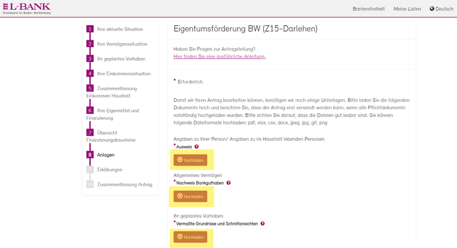 Jetzt müssen Sie die erforderlichen Dokumente hochladen. Welche Dokumente das sind, sehen Sie im Abschnitt „Anlagen“.