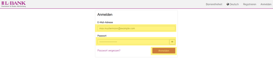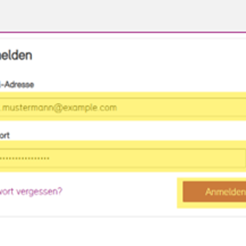 Erfassen Sie in der Anmeldemaske Ihre E-Mail-Adresse aus der Registrierung und geben Sie Ihr neu vergebenes Passwort ein. Klicken Sie abschließend auf den Button „Anmelden“.