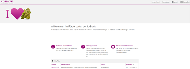 Anschließend sind Sie wieder im Förderportal angemeldet und können die Funktionen dieses Portals nutzen.